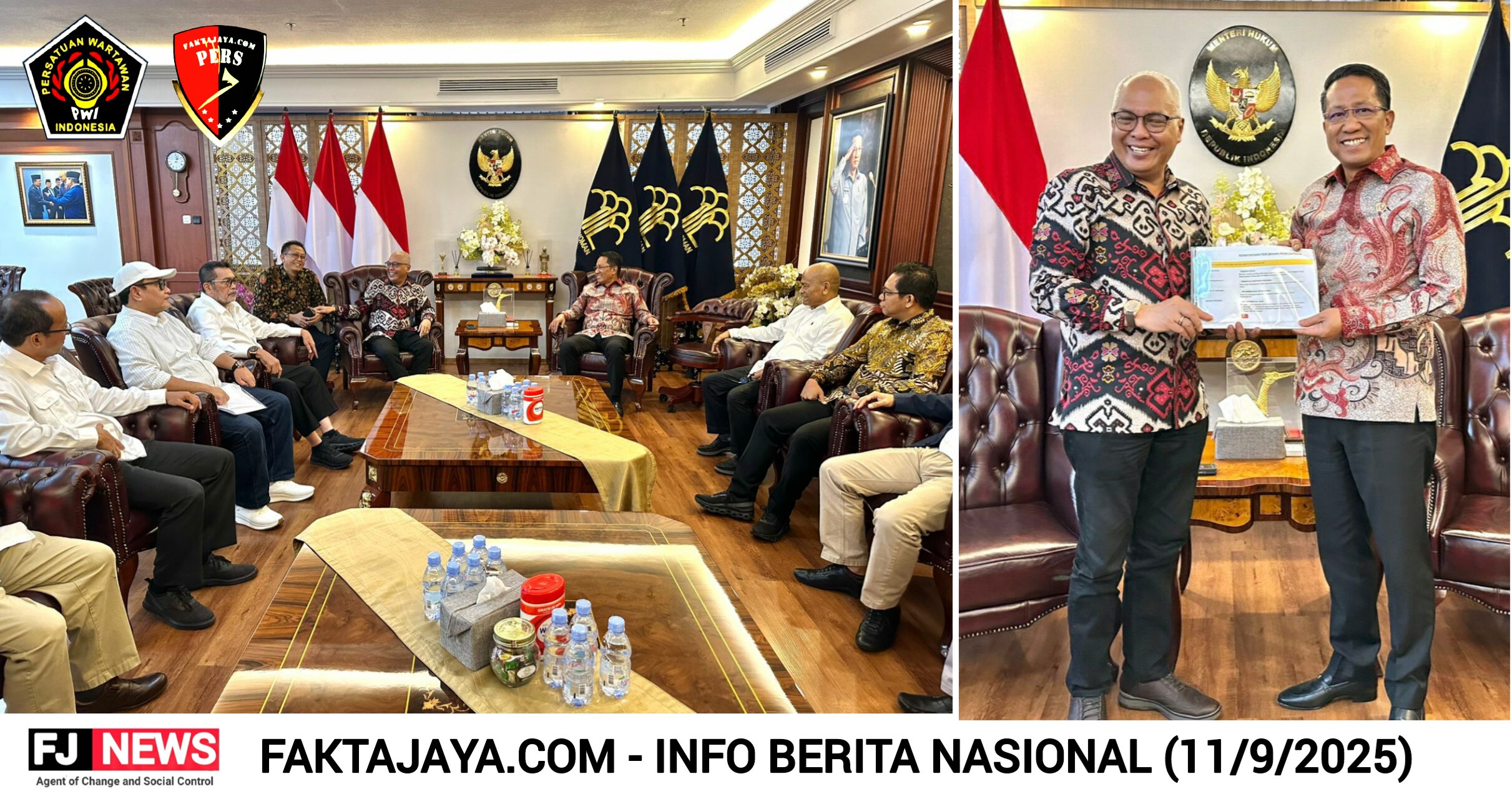FAKTAJAYA.COM, JAKARTA – Usai sukses menggelar Kongres Persatuan, Pengurus Persatuan Wartawan Indonesia (PWI) Pusat dipimpin Ketua Umum terpilih, Akhmad Munir, diterima langsung oleh Menteri Hukum, Supratman Andi Agtas, pada Kamis (11/9/2025).